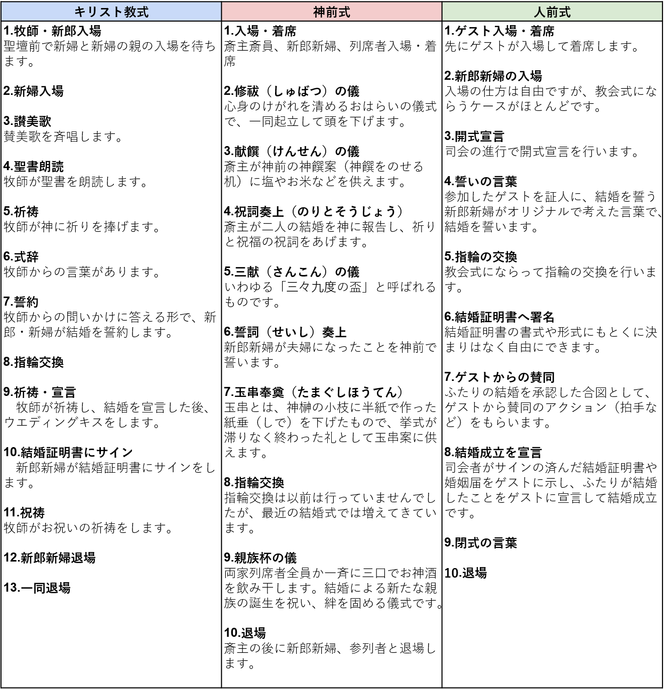 日本でとくに人気のある挙式「キリスト教式」「神前式」「人前式」の流れを比べてみましょう。